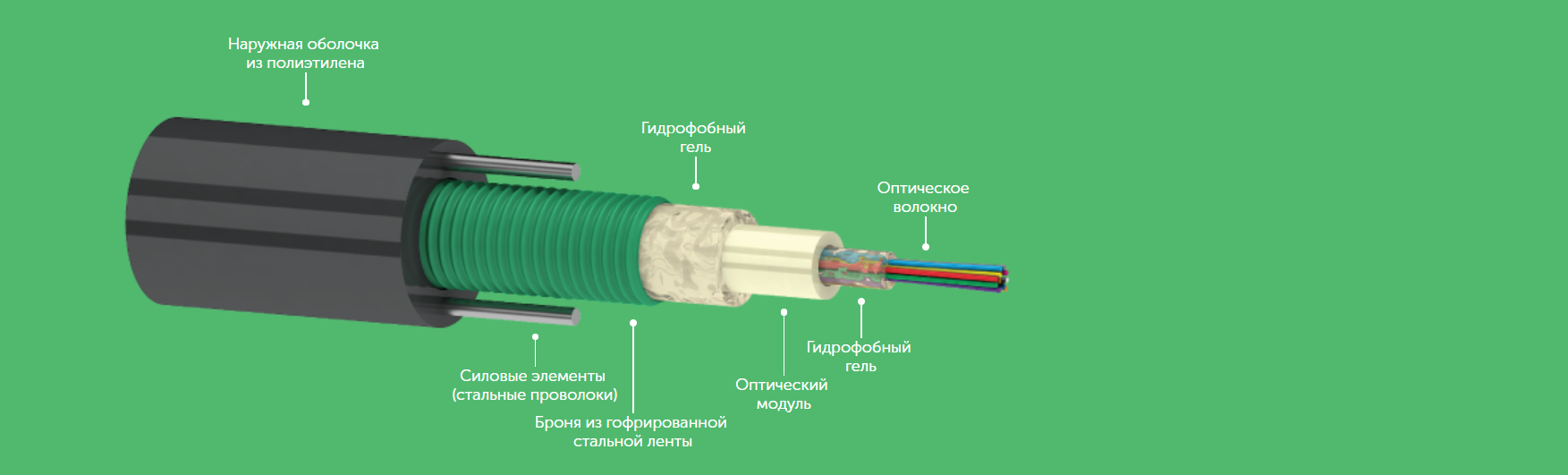 Оптический кабель типа ОККЦ предназначен для прокладки в кабельной канализации, трубах, лотках, блоках, тоннелях, коллекторах, по мостам и эстакадам, в грунт, между зданиями и сооружениям, а также внутри зданий, при опасности повреждения грызунами