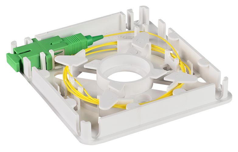 Оптический кабель разделывается и фиксируется на основании корпуса. Волокно сваривается с пигтейлом, КДЗС закрепляется в ложементе. Возможно использование механических соединителей типа Fibrlok. Адаптер устанавливается в одно из посадочных мест на основании корпуса.