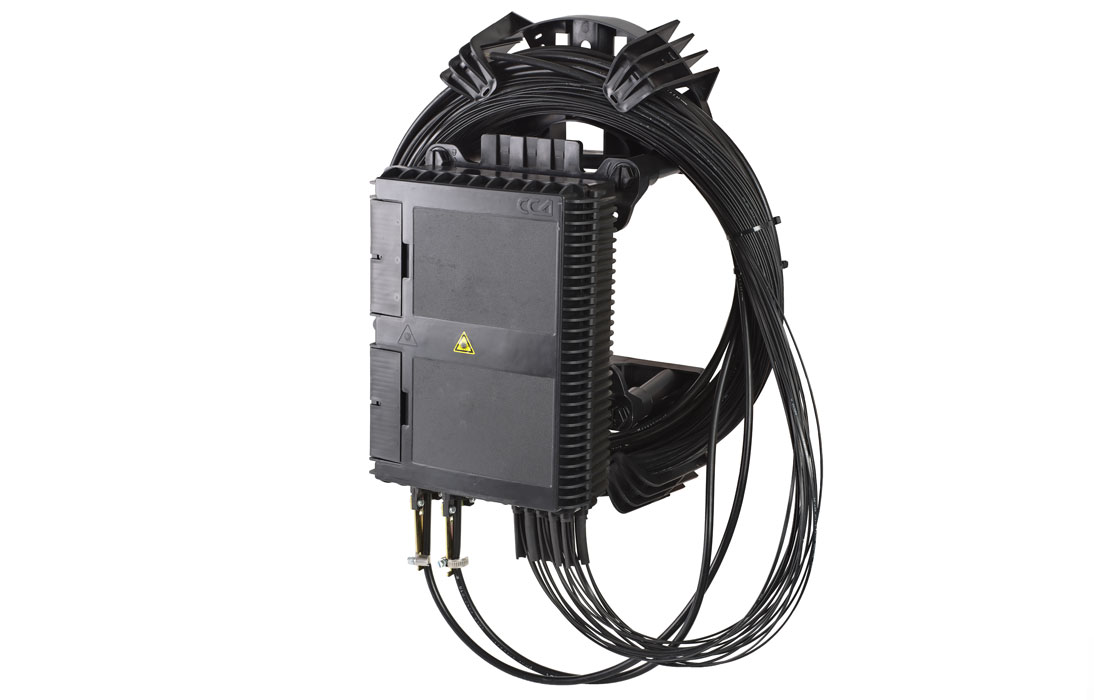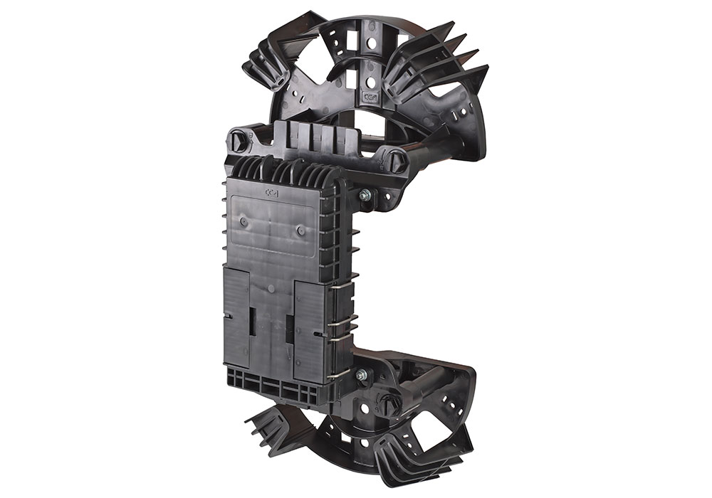Все детали УПМК изготовлены из пластика, что уменьшает нагрузку на опору и облегчает монтаж, а также значительно увеличивает стойкость изделия к воздействию повышенной влажности и УФ-излучению. Крепление к стенам осуществляется с помощью анкерных болтов или шурупов, а к столбовым опорам монтажной металлической лентой. Конструкция кронштейна для муфт позволяет снимать муфту с опоры и устанавливать ее обратно, без использования специального инструмента и расходных материалов, фиксация осуществляется специальными пластиковыми защёлками. Органайзеры для укладки запаса ВОК разнесены в плоскостях с кронштейном для установки муфт, что исключает пересечение выходящих из муфт-кроссов абонентских дроп-кабелей с бухтой запаса ВОК.