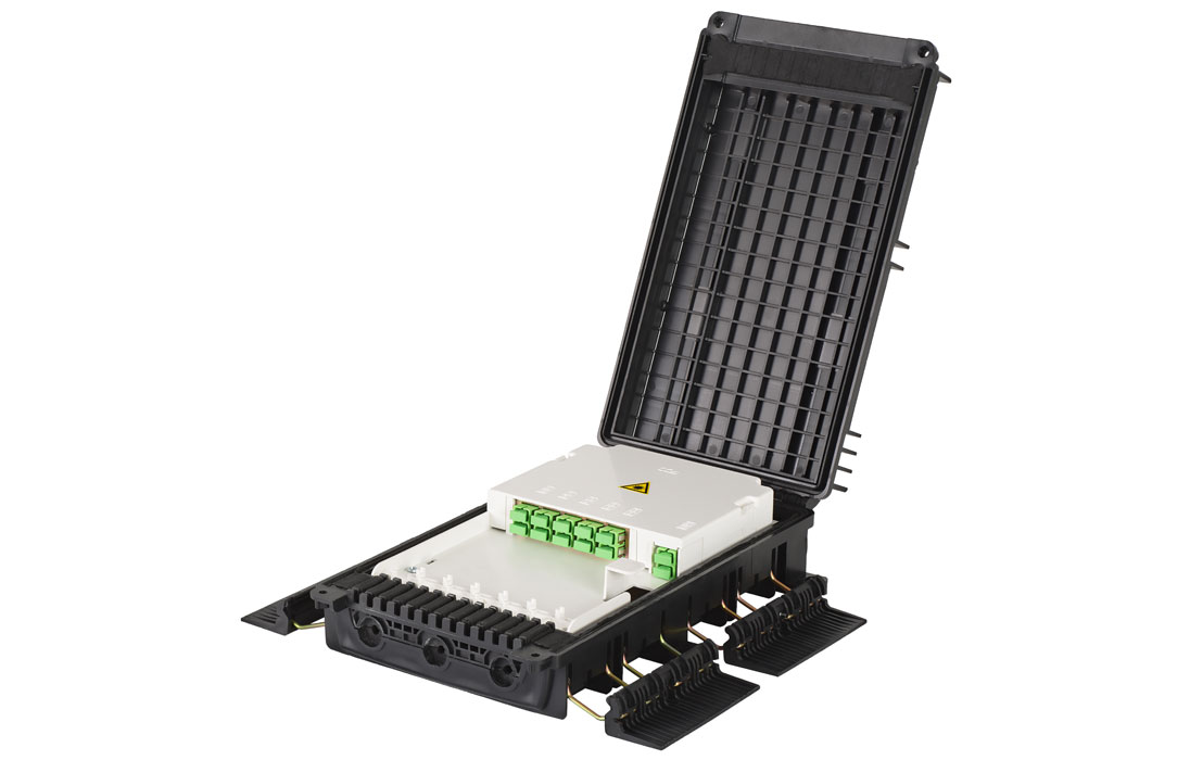 Выполнена из пластмассы и имеет пыле-брызгозащищенную тупиковую конструкцию (ввод ОК и вывод абонентских дроп-кабелей производится с одной стороны).