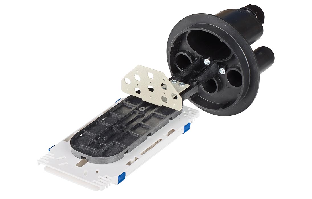 В муфте предусмотрен овальный ввод для транзитной петли оптических модулей без разрезания. Выкладка петли модулей осуществляется на лотке с противоположной стороны от кассет.
