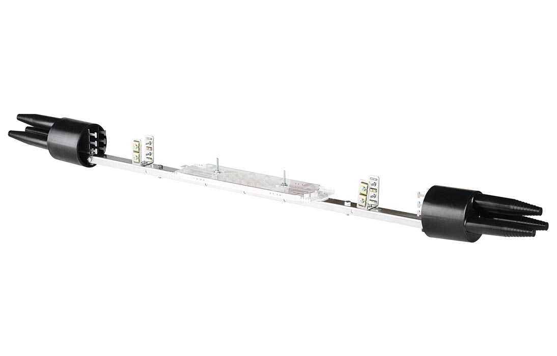 Проходная классическая муфта МОГ-С предназначена для монтажа городских кабелей любых конструкций, в том числе с броней из стальной гофрированной ленты. Применяется для установки в типовых колодцах кабельной канализации, а также в городских коллекторах на стандартных консолях. Способ герметизации корпуса с оголовником осуществляется с помощью термоусаживаемых трубок ТУТ. Повторное вскрытие и последующая герметизация осуществляется с помощью термоусаживаемых манжет ТУМ. Способ герметизации вводов кабелей, осуществляется с помощью термоусаживаемых трубок ТУТ. Круглые патрубки на оголовнике муфты изначально герметичны и имеют ступенчатую форму с разными диаметрами. Срезая патрубок в определенном месте можно подобрать отверстие максимально близкое к диаметру вводимого кабеля. Таким образом, исключается излишнее натяжение ТУТ после усадки при вводе относительно тонких кабелей. Все патрубки муфты оснащены также индивидуальными узлами крепления ЦСЭ. Базовой кассетой для муфты МОГ-С является популярная кассета К48-4525 на 48 ОВ, которая позволяет использовать муфту при сращивании кабелей с различными количествами волокон в модулях, обеспечивая ввод любых модулей на кассету целиком, без применения адаптеров. Для установки муфты в заполненных колодцах дополнительно рекомендуется приобрести консоли КСО-2 или КСО-3. Их устанавливают на стенках колодцев выше уровня кронштейнов, чтобы муфта находилась в промежутке между верхушками кронштейнов и потолком колодца. Бухты запасов кабелей при этом размещают в углах колодцев.