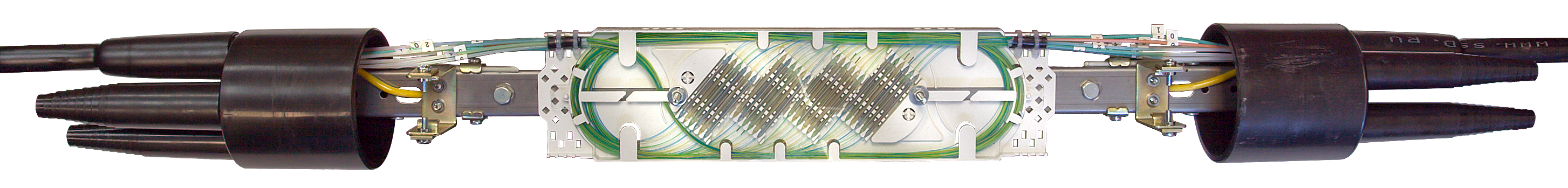 Проходная транзитная муфта МОГ-У предназначена для монтажа городских кабелей любых конструкций, в том числе с броней из стальной гофрированной ленты. Муфта является укороченным вариантом классической муфты МОГ-С. Применяется для установки в плотно заполненных колодцах кабельной канализации, в нетиповых колодцах, а также в местах, где расстояние между консолями меньше 700 мм. В муфте предусмотрен овальный ввод для транзитной петли оптических модулей без разрезания. Выкладка петли модулей осуществляется на лотке с противоположной стороны от кассет. Способ герметизации корпуса с оголовником осуществляется с помощью термоусаживаемых трубок ТУТ. Повторное вскрытие и последующая герметизация осуществляется с помощью термоусаживаемых манжет ТУМ. Способ герметизации вводов кабелей, осуществляется с помощью термоусаживаемых трубок ТУТ. Круглые патрубки на оголовнике муфты изначально герметичны и имеют ступенчатую форму с разными диаметрами. Срезая патрубок в определенном месте можно подобрать отверстие максимально близкое к диаметру вводимого кабеля. Таким образом, исключается излишнее натяжение ТУТ после усадки при вводе относительно тонких кабелей. Все патрубки муфты оснащены также индивидуальными узлами крепления ЦСЭ. Базовой кассетой для муфты МОГ-У является популярная кассета К48-4525 на 48 ОВ, которая позволяет использовать муфту при сращивании кабелей с различными количествами волокон в модулях, обеспечивая ввод любых модулей на кассету целиком, без применения адаптеров. Овальный патрубок муфты может использоваться для одного из перечисленных случаев: 1) ввода транзитной петли кабеля или 2) ввода двух кабелей диаметром до 25 мм. В обоих случаях для герметизации необходимо дополнительно приобрести «Ввод №6». Для установки муфты в заполненных колодцах дополнительно рекомендуется приобрести консоли КСО-2 или КСО-3. Их устанавливают на стенках колодцев выше уровня кронштейнов, чтобы муфта находилась в промежутке между верхушками кронштейнов и потолком колодца. Бухты запасов кабелей при этом размещают в углах колодцев.