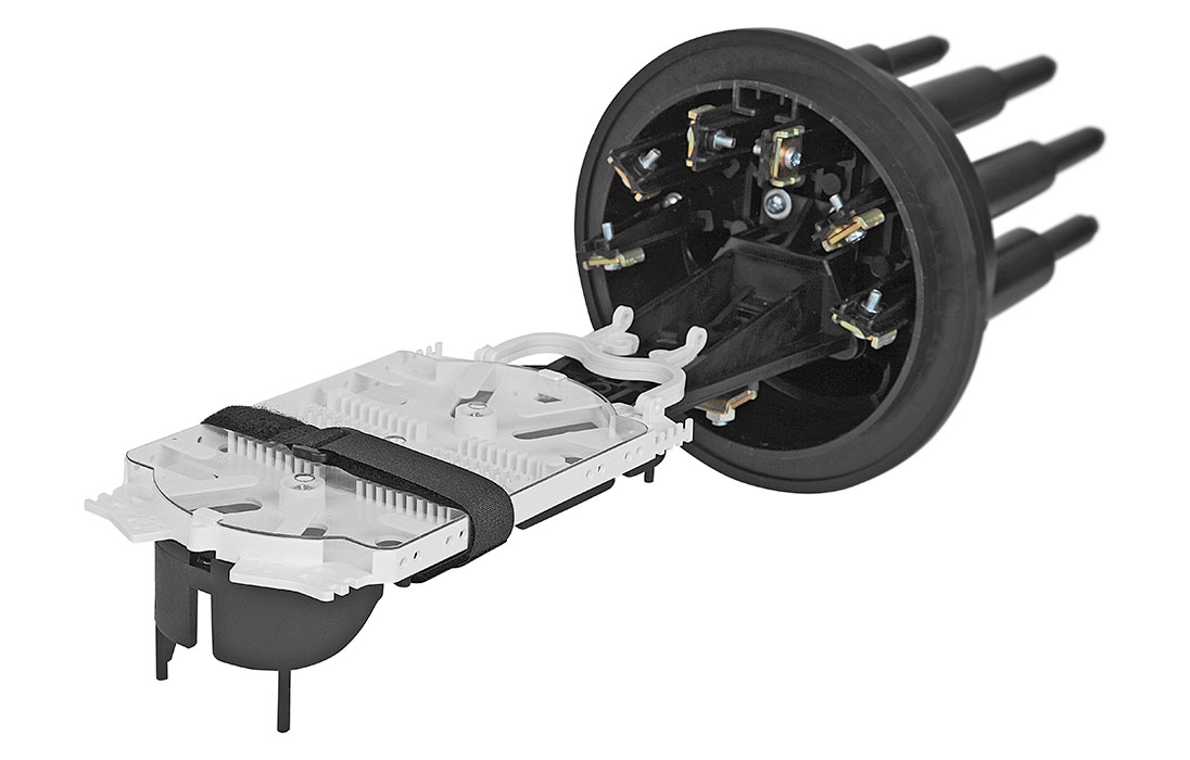 Способ герметизации вводов кабелей, осуществляется с помощью термоусаживаемых трубок ТУТ. Круглые патрубки на оголовнике муфты изначально герметичны и имеют ступенчатую форму с разными диаметрами. Срезая патрубок в определенном месте можно подобрать отверстие максимально близкое к диаметру вводимого кабеля. Таким образом, исключается излишнее натяжение ТУТ после усадки при вводе относительно тонких кабелей. Все патрубки муфты оснащены также индивидуальными узлами крепления ЦСЭ.