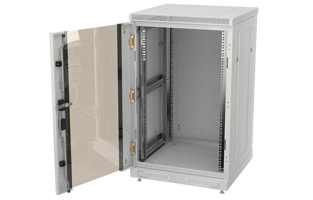 За счет элементов крепления каркас шкафа имеет повышенную жесткость. Распределенная вертикальная нагрузка до 600 кг. Стандартно шкаф комплектуется: передней дверью, боковыми и задней стенками с замками.